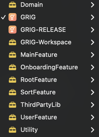 이렇게 4개의 모듈을 만들었습니다. 정말 마지막으로 .xcodeproj가 여러개라면 .xcworkspace가 필요하기에 Workspace.swift를 만들겁니다. Manifests Group아래에 Workspace.swift 파일을 만들어주세요. 내용물은 아래처럼 채워주세요.