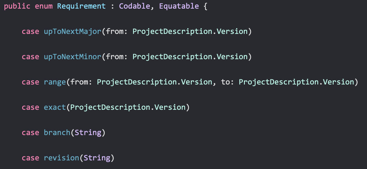 - range(from: ProjectDescription.Version, to: ProjectDescription.Version) : from부터 to 까지의 버전을 사용합니다.